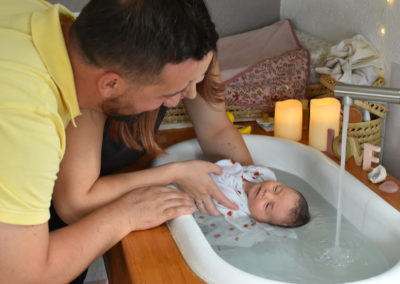 Afin de connaître l’histoire de votre famille, votre bébé, poser des mots, accueillir les émotions, nous auront un moment d’échange au sujet de votre grossesse et la naissance de votre enfant. Puis bébé sera emmailloté en douceur. Son rythme respécté, bébé atterrit tranquillement dans le bain. Je l’accompagne vers la détente et le relâchement.
